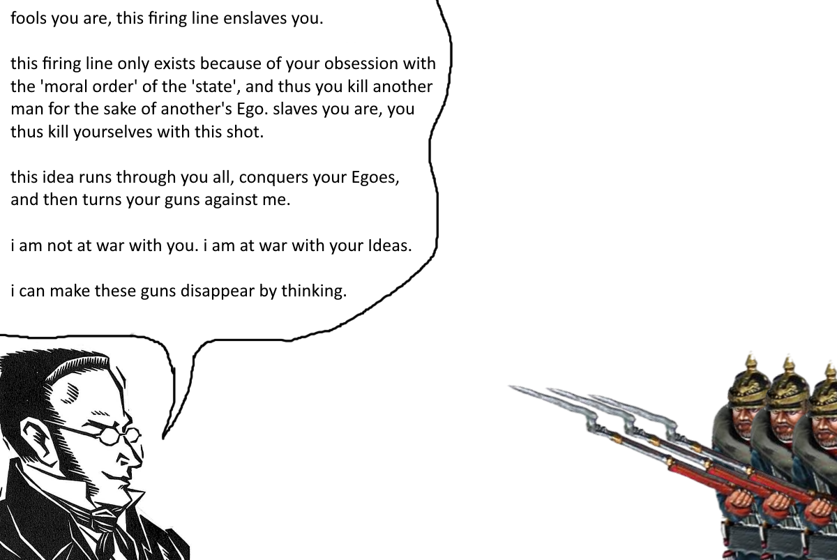 let us do the same. let us hit the entropic ideas bong together, and evaporate stirner into the mist he is. all’s left are his words. behind them, a poltergeist. we must banish this poltergeist, and in doing so, see the words as they are: none of our concern.